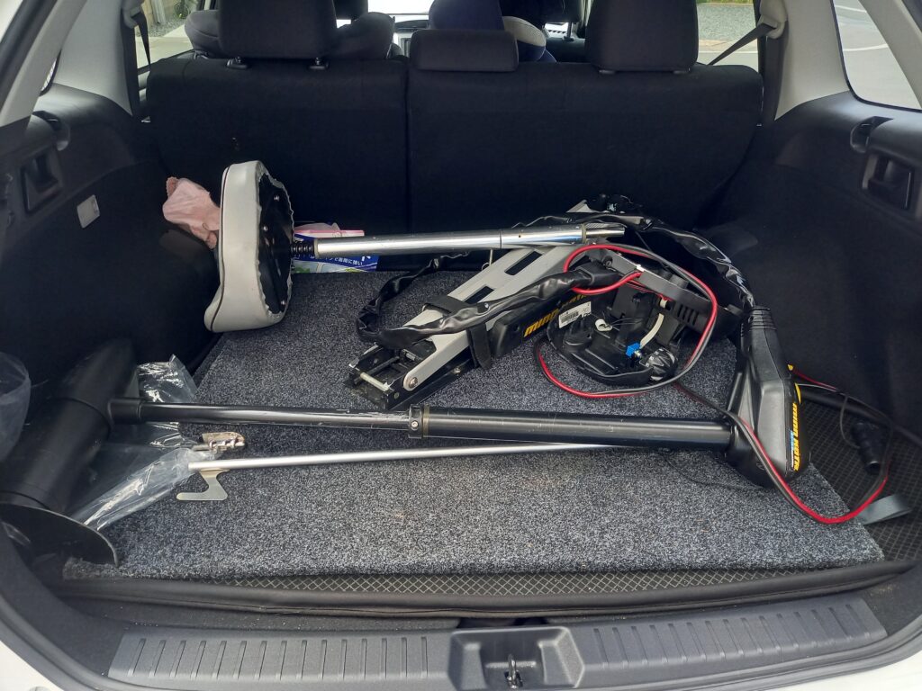 ハンドエレキの重さは10kg(モーターガイドの12V 45lb 無段階)なので、1/3くらいになります。準備は圧倒的に楽です。忘れ物の心配も少ないです。