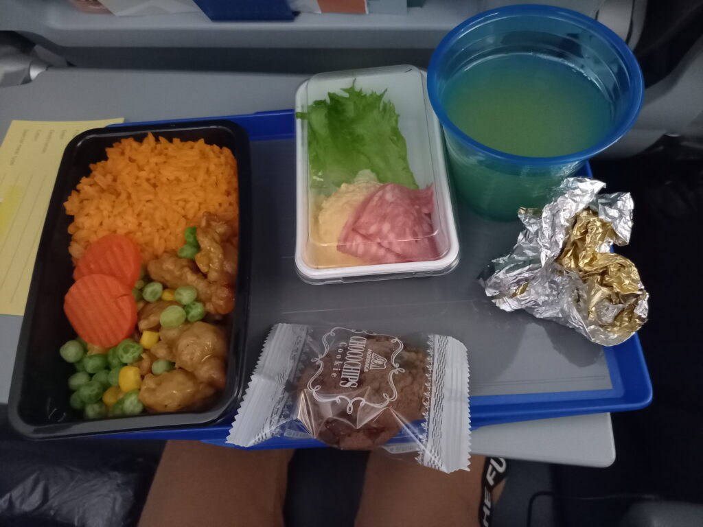 ユナイテッド航空で関空からグアムまでは3時間半くらいですが、機内食が出ました。子供たちは、キッズメニュー。離陸してから早々に持ってきてくれました。チキンライスとチキンでした。人参とグリンピースとポテトサラダ以外は、おいしそうに食べてました。