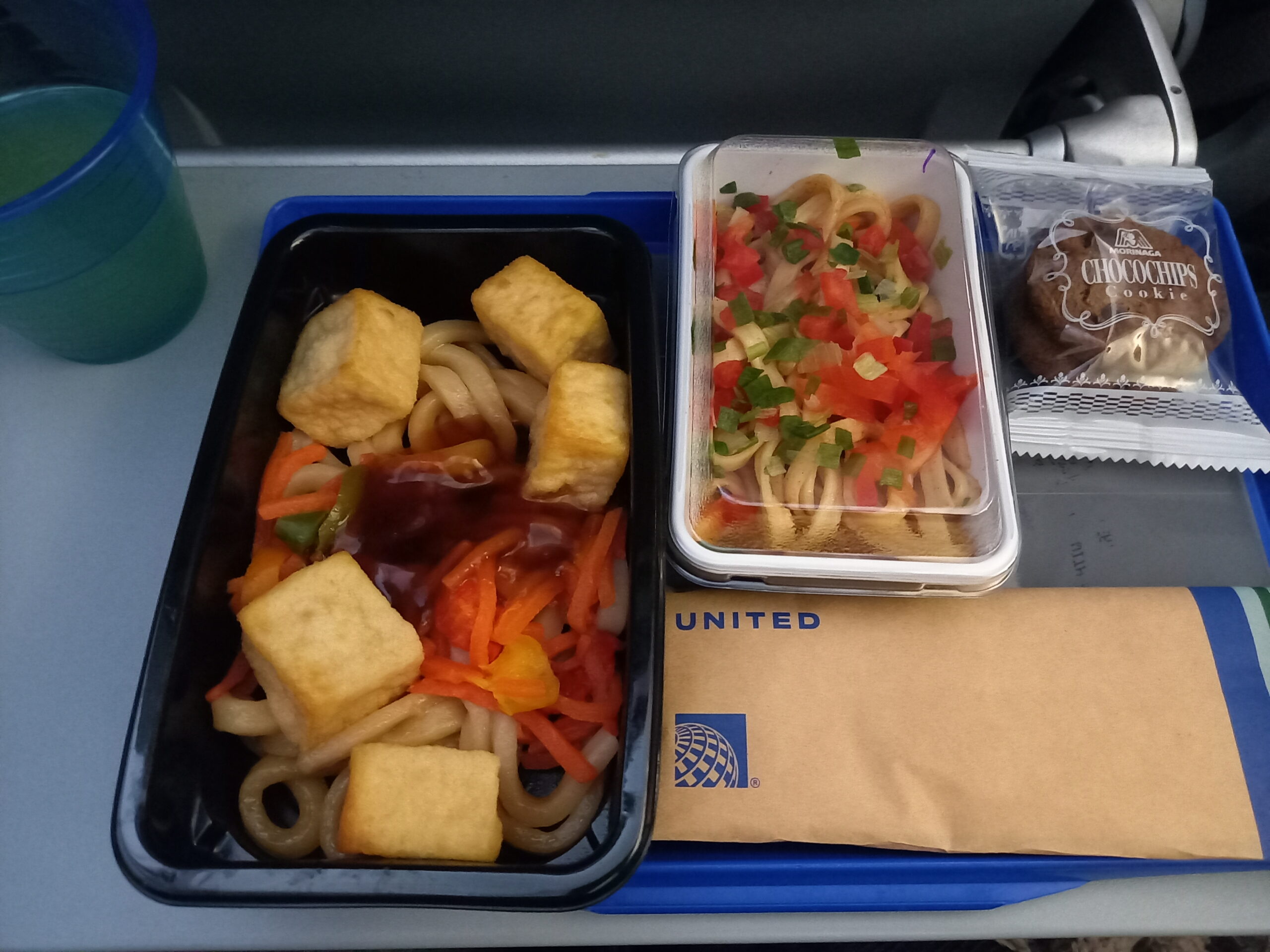 大人のメニューは「チキン」か「うどん・豆腐」か聞かれました。子供のメニューがチキンだったので「うどん・豆腐」にしました。あと、機内食のうどんが気になったので。
