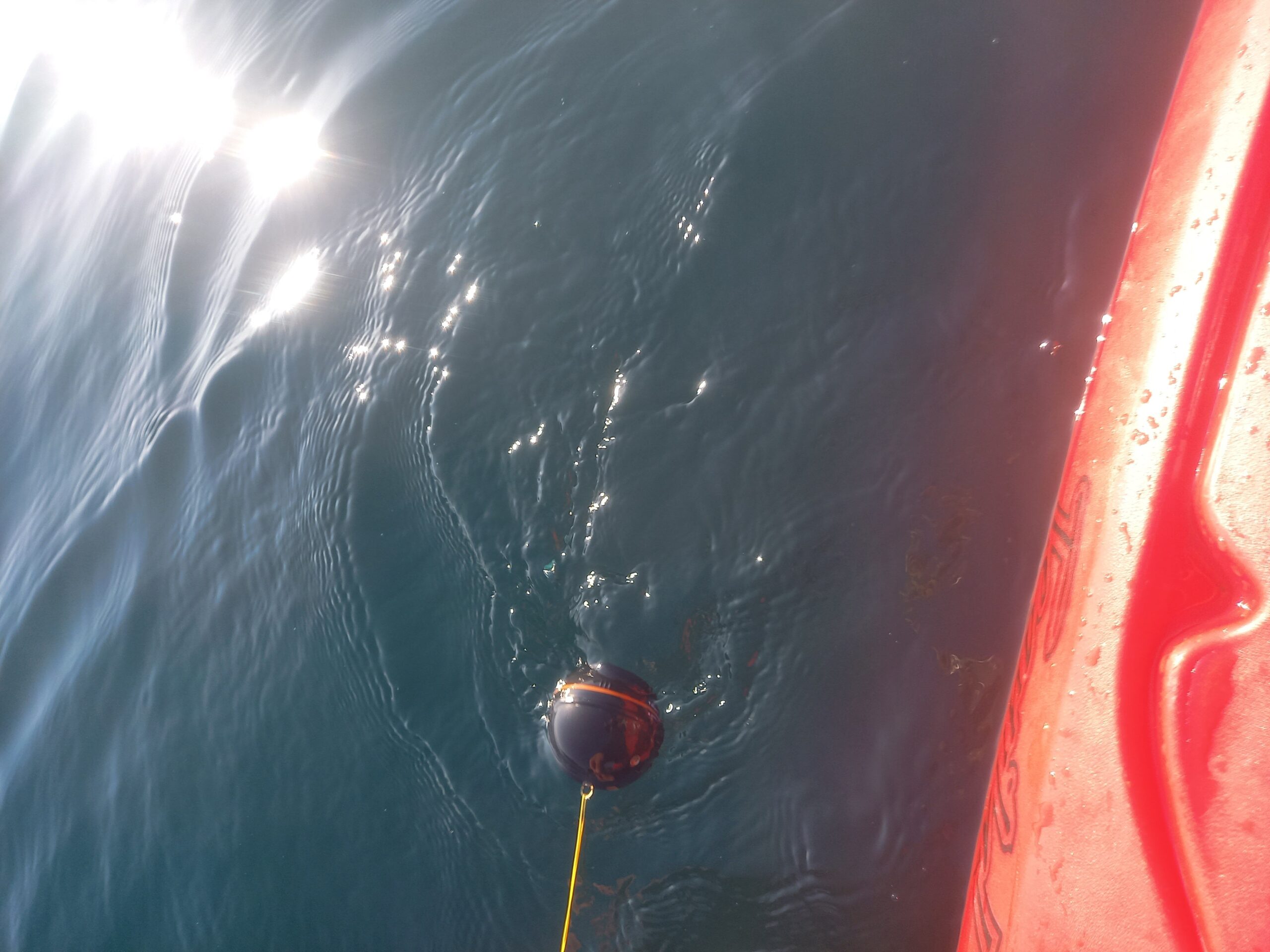 Deeperは魚探なので、水面に対して垂直である必要があります。もし斜めになると、正しく水深が測れません。しかし、カヤックが進み釣り糸でDeeperが引っ張られると、Deeperが傾いてしまいます。下の写真は、Deeperが引っ張られて傾いているときの状態です。